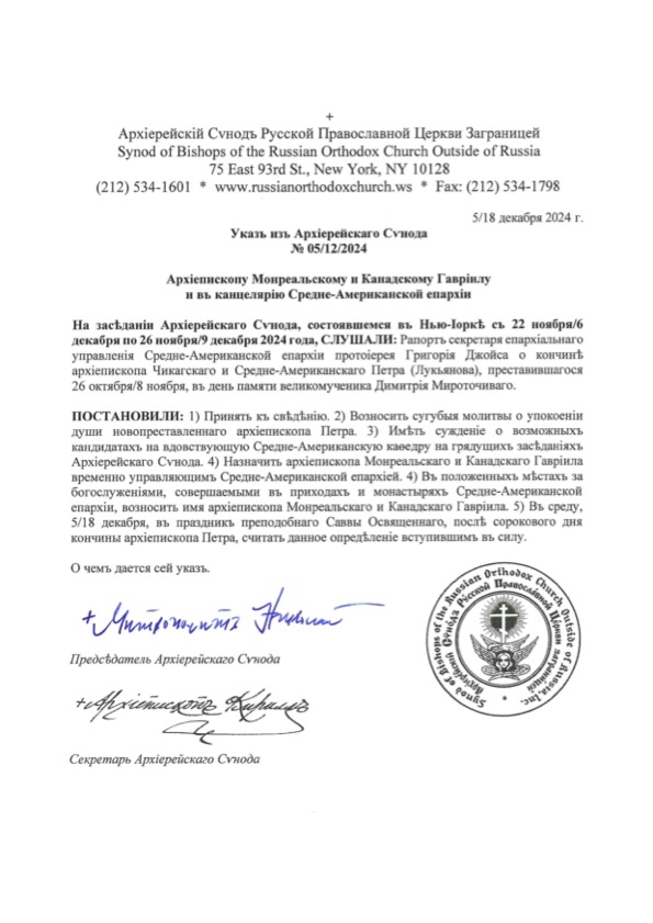 At the session of the Synod of Bishops held in New York City from November 22 / December 6 to November 26/9, 2024, those present heard a  report from Archpriest Gregory Joyce, Secretary of the Diocesan Administration of the Mid-American Diocese, on the death of Archbishop Peter (Lukianoff) of Chicago and Mid-America, who passed away on October 26/November 8, on the day of the Great Martyr Demetrius the Myrrh-bearer.